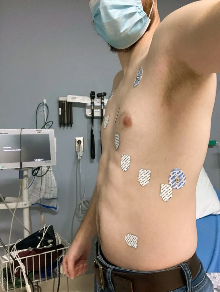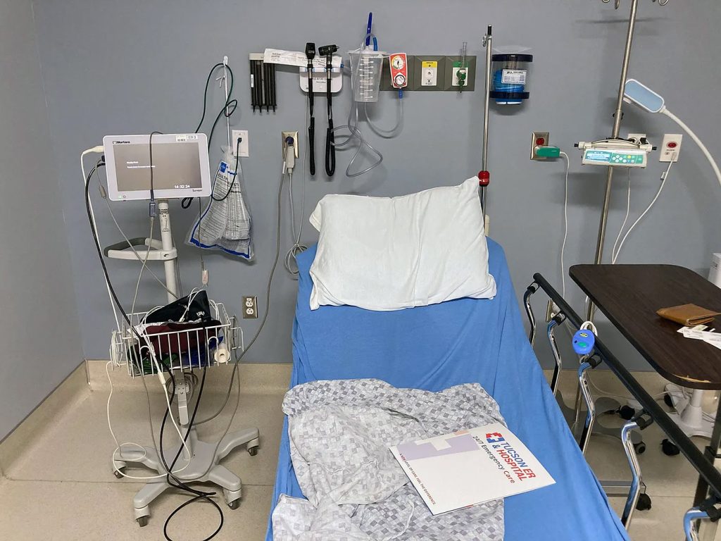 After I finally finished all the paperwork, they called my name, and I went back into one of the rooms, stripped down, put on a COVID mask and a gown, and laid down on the hospital bed.