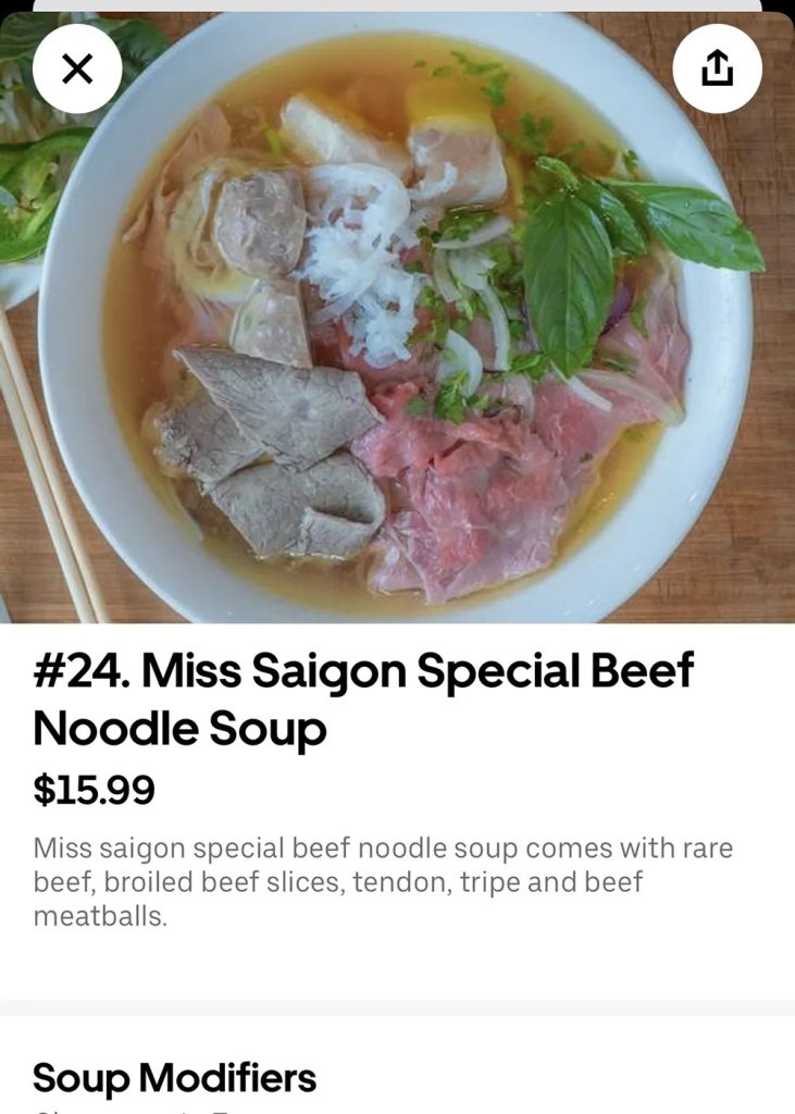 In my case, I decided to order Pho Xe Lua (Special Beef Noodle Soup). From what I can tell, the entree would be $12.99 if I walked into the store and bought it off the menu. In the app, it’s $15.99, so it’s $3.00 extra. Again, not a huge deal, but something to keep in mind.