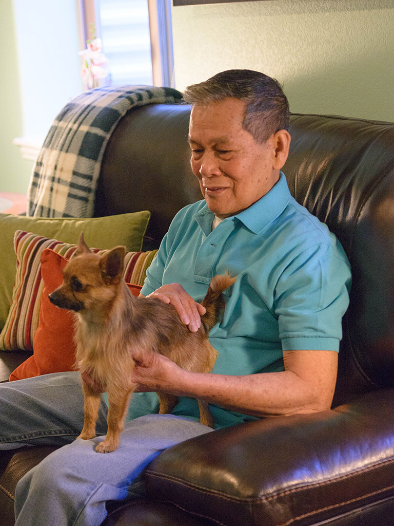 The first thing the Patis did after hearing the official word was to call their insurance company. Coincidentally, they had just changed insurance companies two years earlier: “We used to have bad insurance—they didn’t want to replace our roof even though it was very old and had wood shingles. We finally got them to replace it, and as soon as they did, we switched insurance companies” Tina recalls. “Our new insurance company is much better, which is good because they did a great job helping us after the fire.” The couple stayed with Tina’s mother for a few weeks until their insurance sorted out a way for them to rent a place of their own, then they moved to an open apartment in the same complex. They also added a new member to their family—a little puppy (Chihuahua and Yorkie) mix. His name shows their sense of humor: they named him “Waldo.” Jerry remembers: “It was sad because 2 or 3 months before the fire, I spent a bunch of my military retirement money on fixing up the house—I paid $18,000 to replace all the windows on the house because the original windows were cheap and ugly. I also bought a brand new flat screen TV, brand new beds, and a brand new computer. Then the fire came and destroyed it all.” Several of the neighbors had been upgrading their homes right before the fire: “Our neighbor across the street was doing a big home improvement project, and so were a few others, then the fire came and burned everything.” When asked about what she was and wasn’t able to rescue from the fire, Tina pauses: “I had taken all the important papers when we were evacuated, but one thing I did not bring was our pictures. Since I’m the oldest of 11 children, my mom gave me all the family photos, and we lost all of them in the fire. They’re all gone now.”